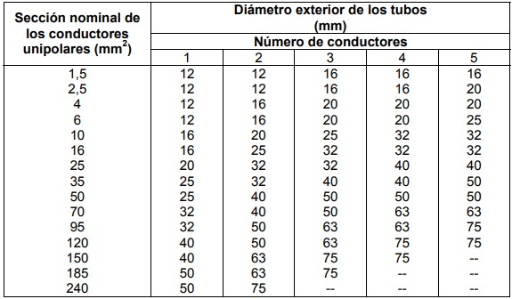 La sección interior del tubo debe ser, como mínimo, 2,5 veces la suma de las secciones ocupadas por los conductores.